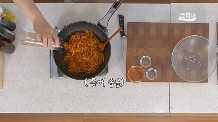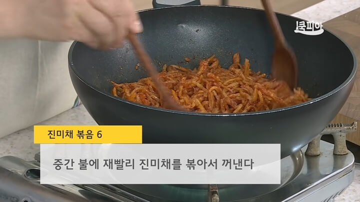 양념을 다 버무렸다면 다시 불을 켜고 중불 정도로 낮춘 후 진미채를 볶아줍니다.