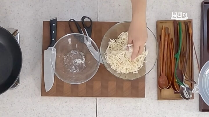 진미채는 물에 재빨리 한번 씻어낸 후 마른 팬에 덖어서 물기를 날려줍니다. 그런 다음 진미채를 먹기 좋은 크기로 잘라줍니다. 3cm 정도의 길이로 해서 가위로 잘라주면 됩니다.