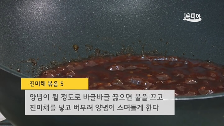 불을 끈 상태에서 양념을 버무리는 이유는 만약 강불 상태에서 진미채를 넣고 버무리면 양념이 속까지 배지 않고 겉돌면서 타버릴 수 있고, 타버리면 맛이 없는 냄새가 납니다. 그러니 불을 끄고 양념을 충분히 잘 버무려 주세요.