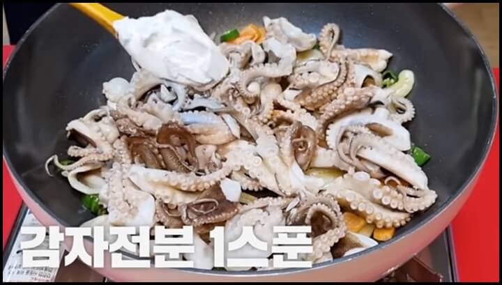 팬이 조금 식으면 쭈꾸미를 넣어줍니다. 그리고 감자전분 1스푼을 넣고 골고루 잘 섞어줍니다. 감자전분을 넣고 만들면 진짜 맛있는 쭈꾸미볶음이 만들어집니다.