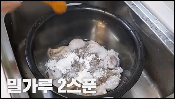 쭈꾸미에 소금 1스푼을 넣고, 밀가루 2스푼을 넣어줍니다. 그리고 손으로 주물러줍니다. 밀가루는 흡착력이 있어서 쭈꾸미에 붙어있는 이물질을 제거하는데 좋습니다.