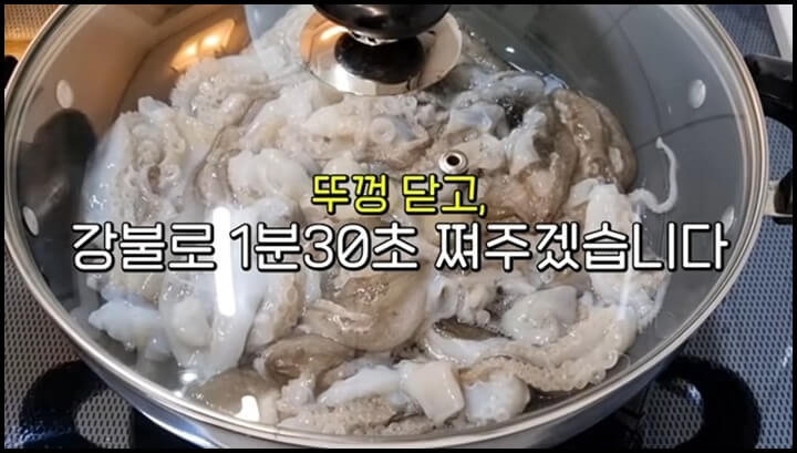 쭈꾸미는 절대 물 넣고 삶지 마세요! 물 넣고 삶게 되면 쭈꾸미의 맛있는 물이 다 빠져버립니다. 그리고 너무 오래 삶으면 질겨지니 딱 1분 30초만 쪄 주면 됩니다.