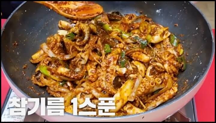 참기름 1스푼, 후추 3꼬집, 통깨 1스푼을 넣고 한번만 볶아주면 쭈꾸미볶음 완성입니다.