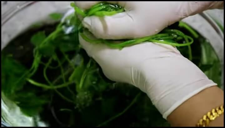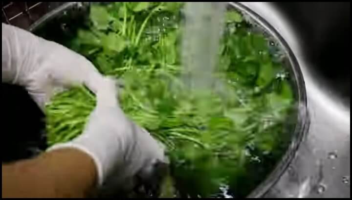 손질한 참나물은 줄기 부분을 손으로 잡고 흐르는 물에서 흔들어가며 씻어줍니다.