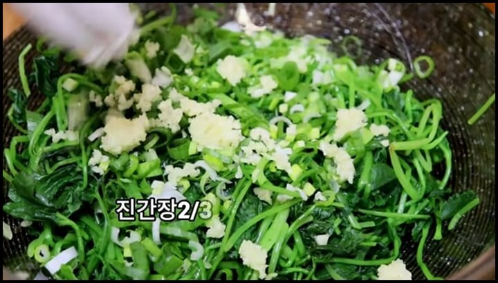 진간장 2/3큰술과 국간장 2/3큰술을 넣은 다음 쪽파와 다진 마늘을 넣어주고 손으로 살살 무쳐줍니다. 억세지 않은 참나물은 바락바락 무칠 필요 없이 손으로 살살 흔들어가며 부드럽게 무쳐주면 됩니다.